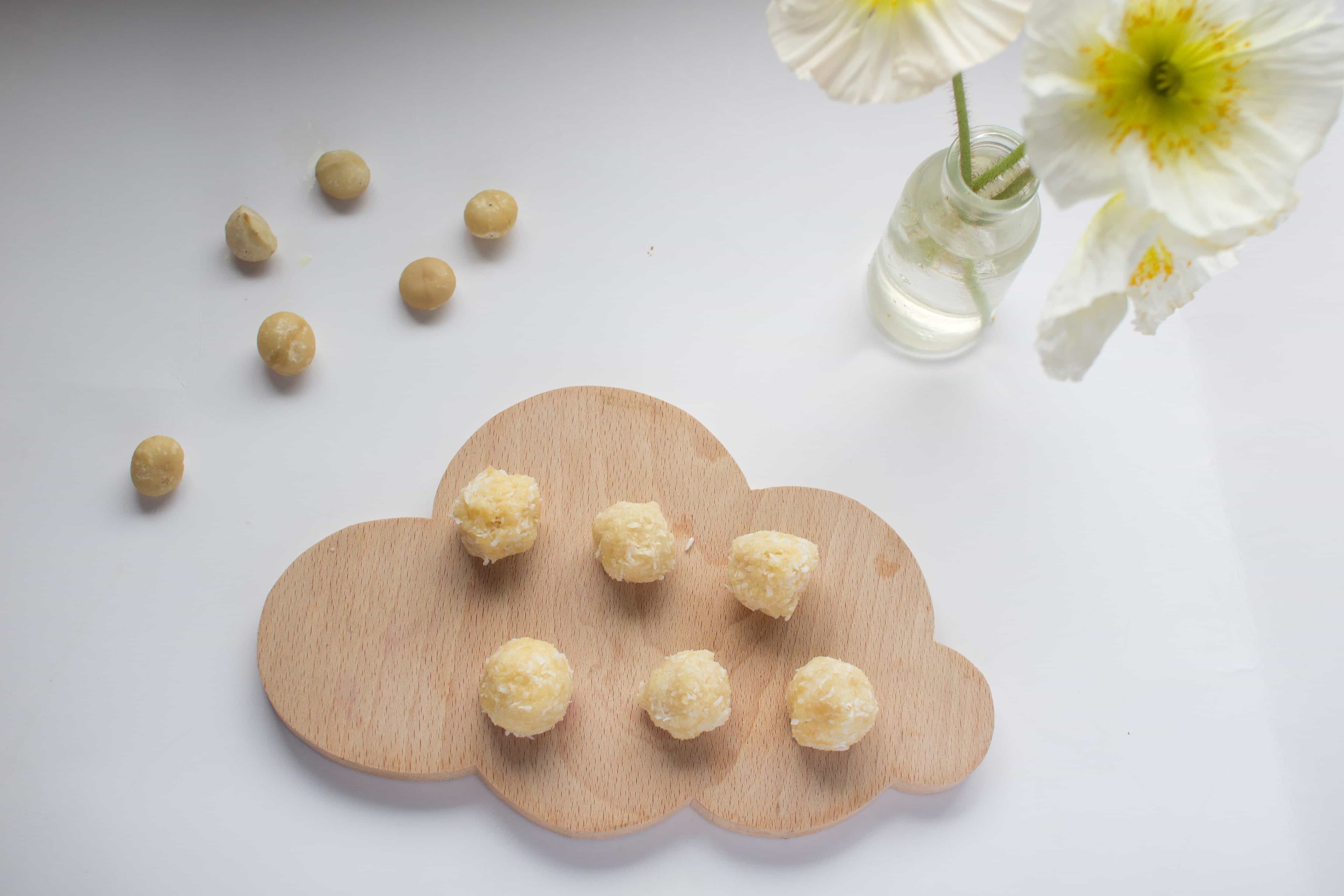 Cut the pineapple into fine pieces, and crush the macadamia nuts into small pieces. I did this with a pestle and mortar but you could crush them in a plastic bag wrapped in tea towels and a rolling pin. Place the pineapple and nuts in a food processor and blend together for a few minutes. Add the coconut and continue to process until the mixture becomes dough like. If it looks a bit wet, add some extra coconut and process again for about 30 seconds.
