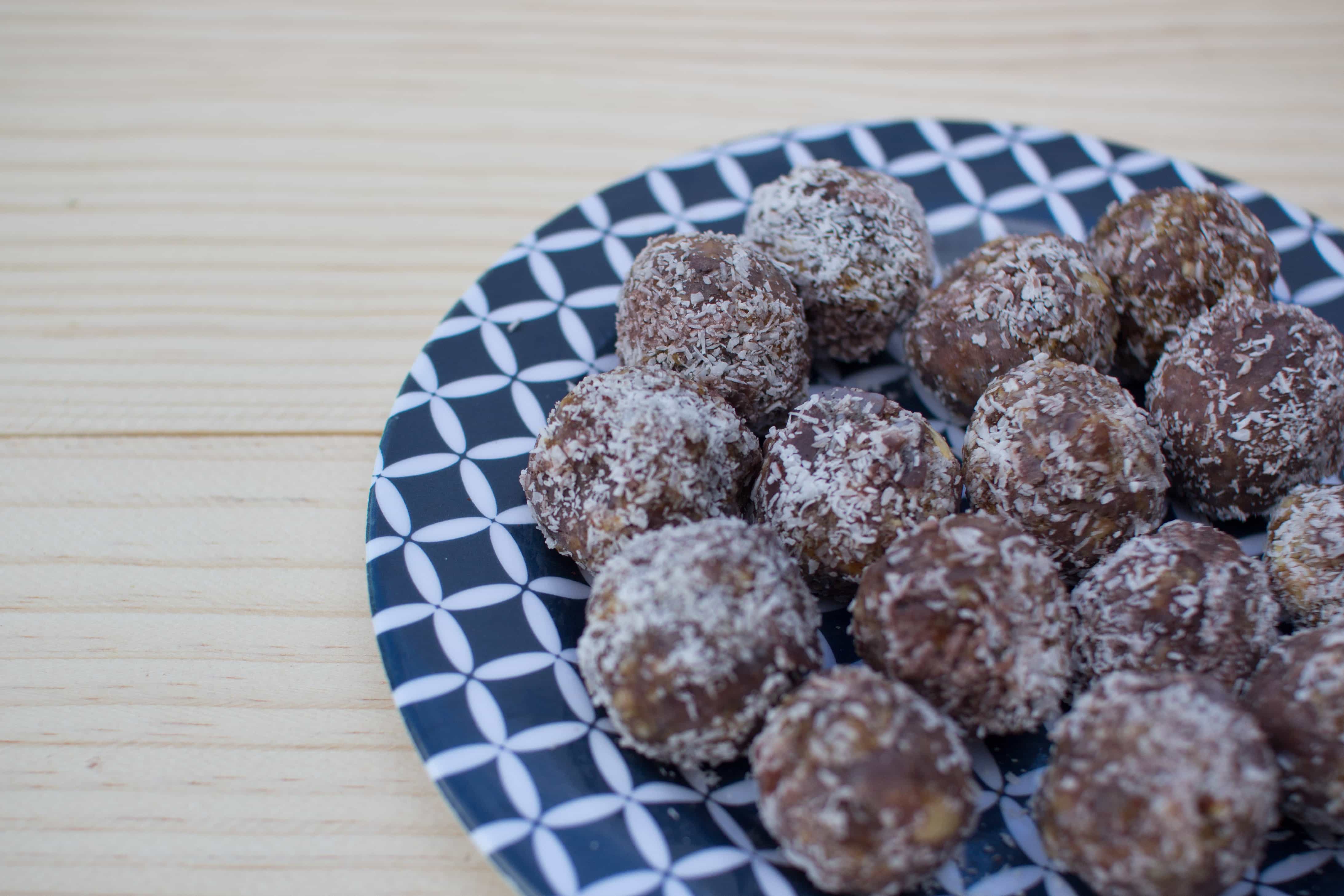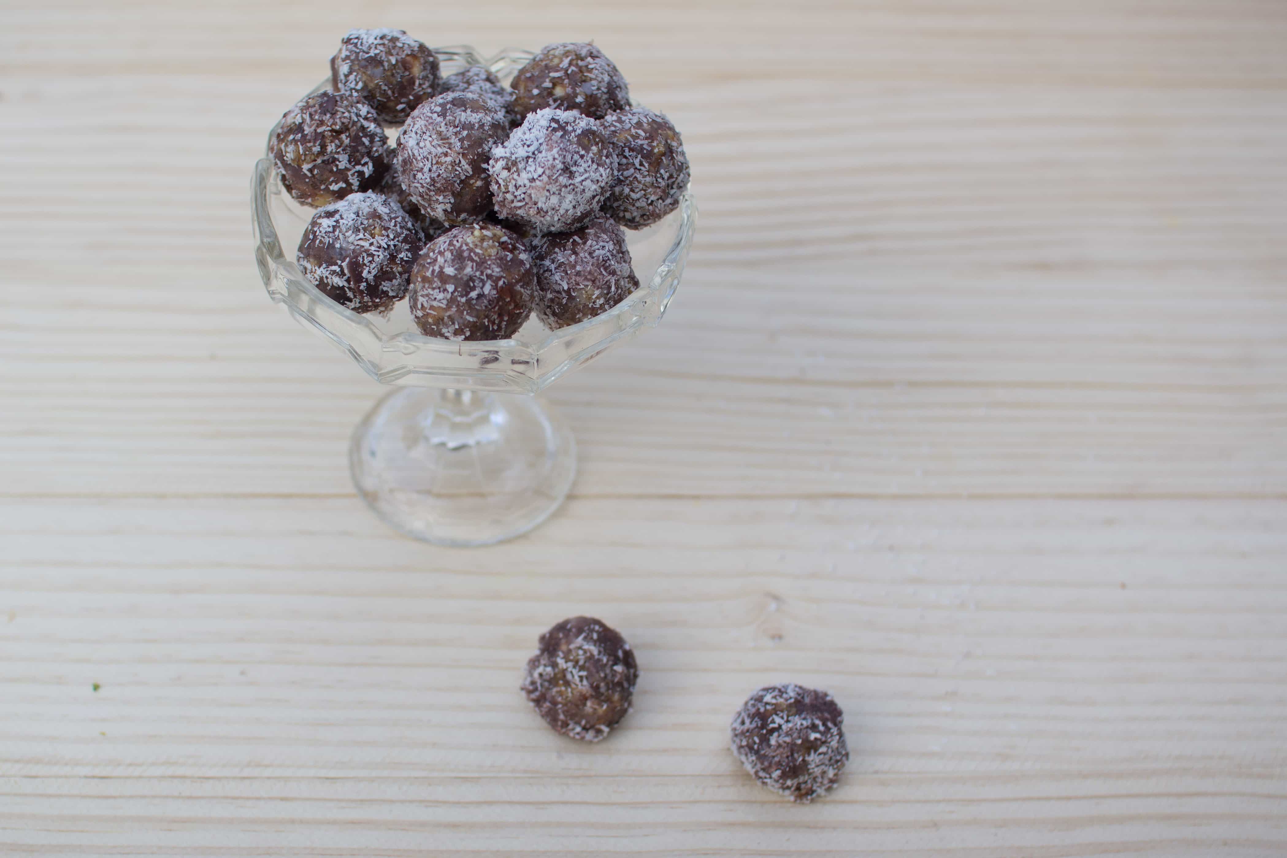 To make the coating – gently heat the coconut oil then mix through the other ingredients. Leave to cool for around 5 minutes then dip the balls into the mixture. The mixture is quite runny, so roll the balls around in it for a bit and you’ll get a nice thin coating. Take out place straight on a place covered in coconut and roll to coat.