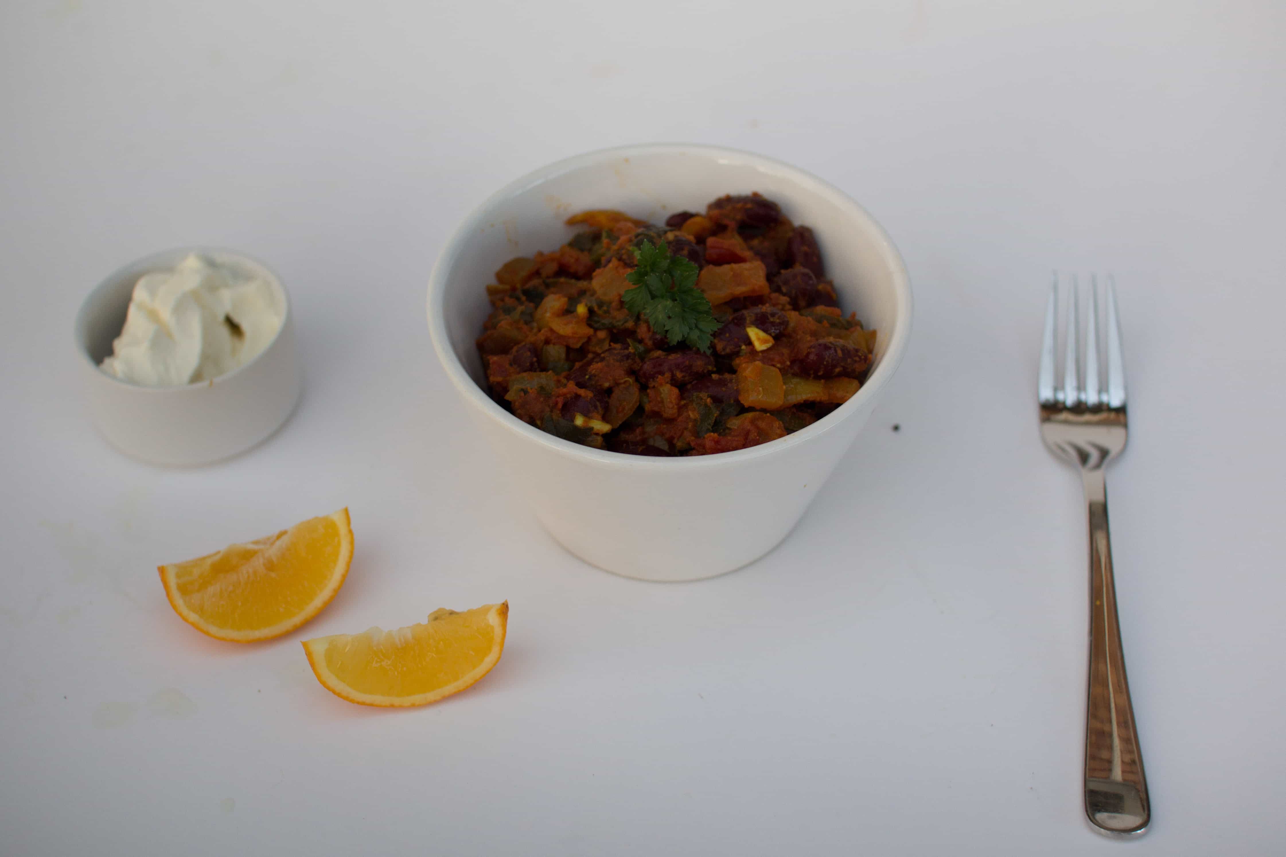 This recipe was supposed to be the Indian dish Chana Masala, made with lovely fragrant spices and chickpeas. Only I had already started and realised I had no chickpeas! Don’t you hate it when that happens…. Instead of throwing everything out and eating toast, I decided to substitute a can of red kidney beans and the good news is it turned out very tasty. Apologies for the photo. It does look better in real life and tastes much better than it looks. Winter mornings before work are not good times for taking photos.