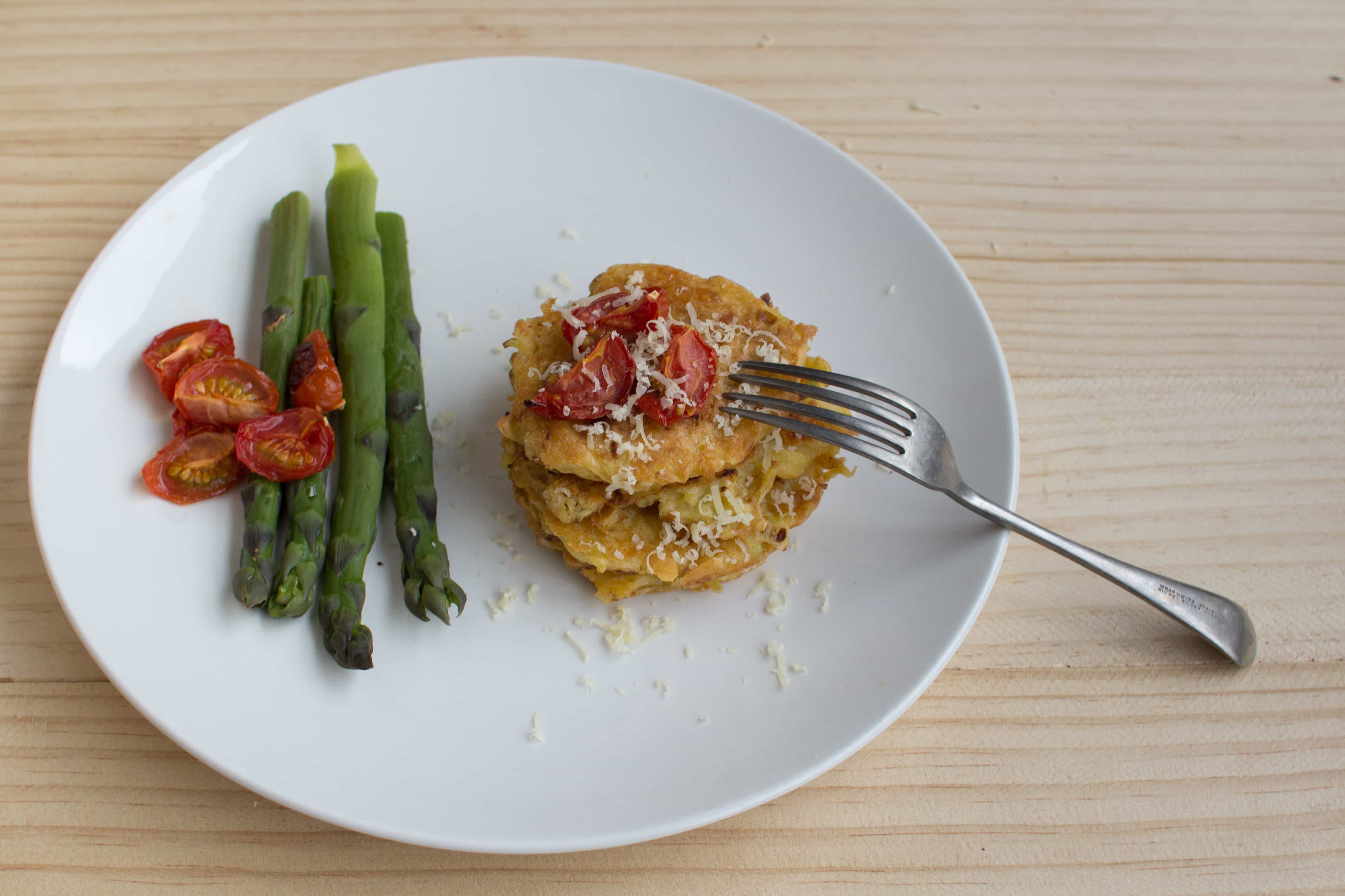 These fritters are delicious by themselves or serve alongside slow roasted tomato and asparagus with a little grated cheese on top. They’d also be amazing with a poached egg on top.