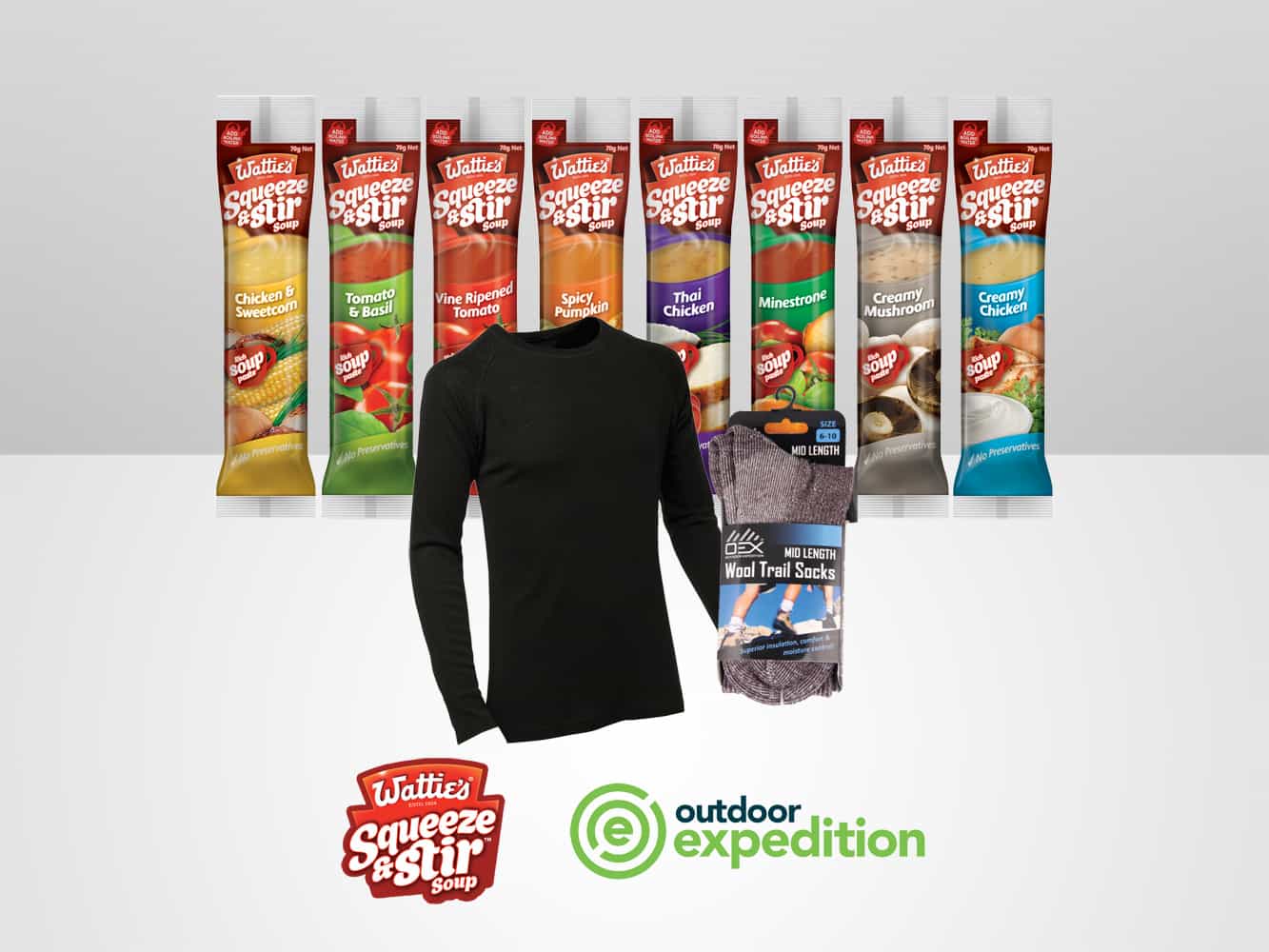 We have a Wattie’s and Outdoor Expedition prize pack to give away, containing all eight delicious Squeeze & Stir instant soups and an OEX Merino Thermal Top and Wool Trail Sock pack valued at $96.
