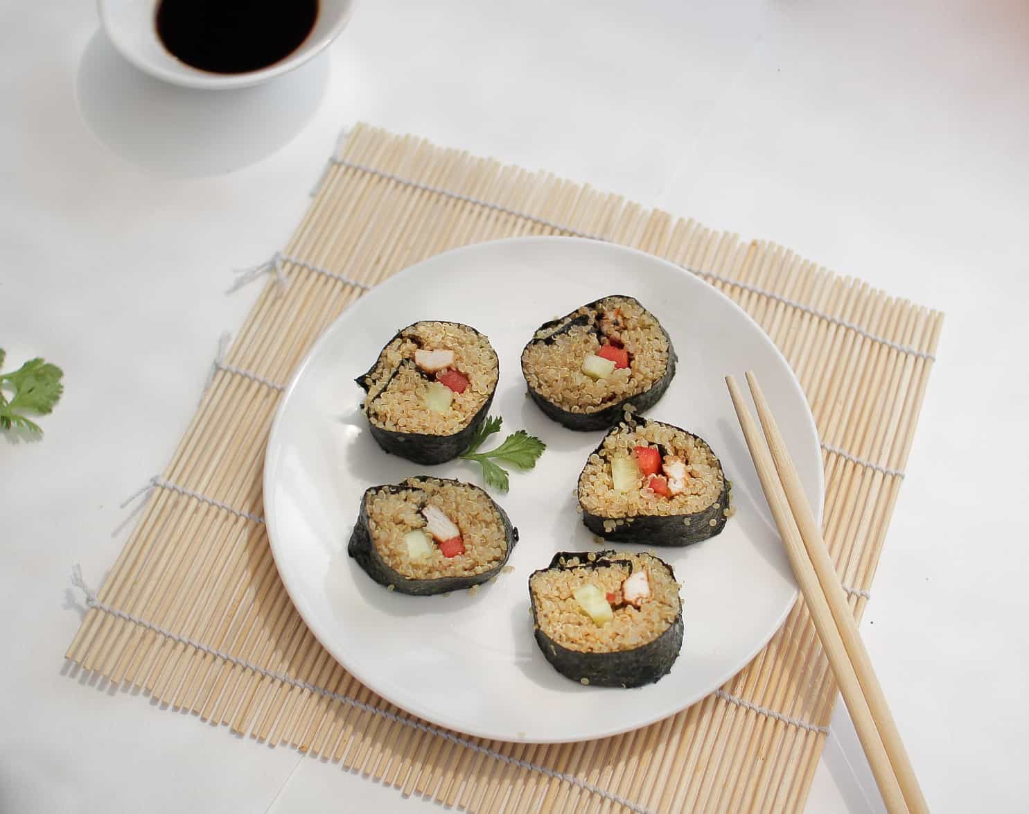 Sushi would have to be one of my favourite lunch on the go options, but I do find I feel hungry early afternoon – likely due to the fact that it’s made with white rice. So I decided to make quinoa sushi. The high protein ‘super grain’ that makes the perfect substitute for rice in sushi. I decided to give quinoa sushi a go in the weekend and it turned out really well. Plus it kept me feeling full all afternoon.