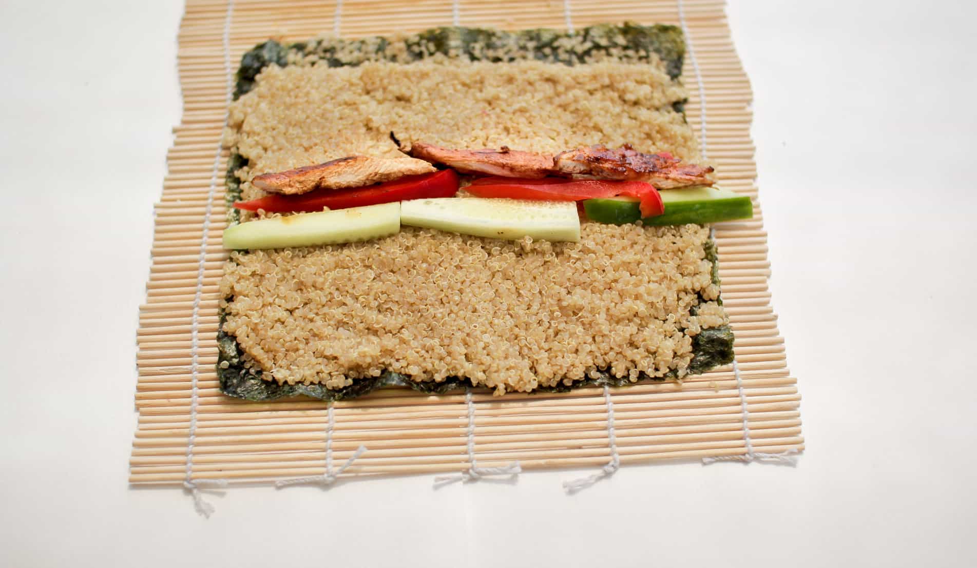 Spread the nori sheet with a thin layer of quinoa, leaving a gap at the edge with no quinoa. Line up your filling ingredients. Keep these thinly sliced as you don’t want to overstuff your sushi roll as it will fall apart.