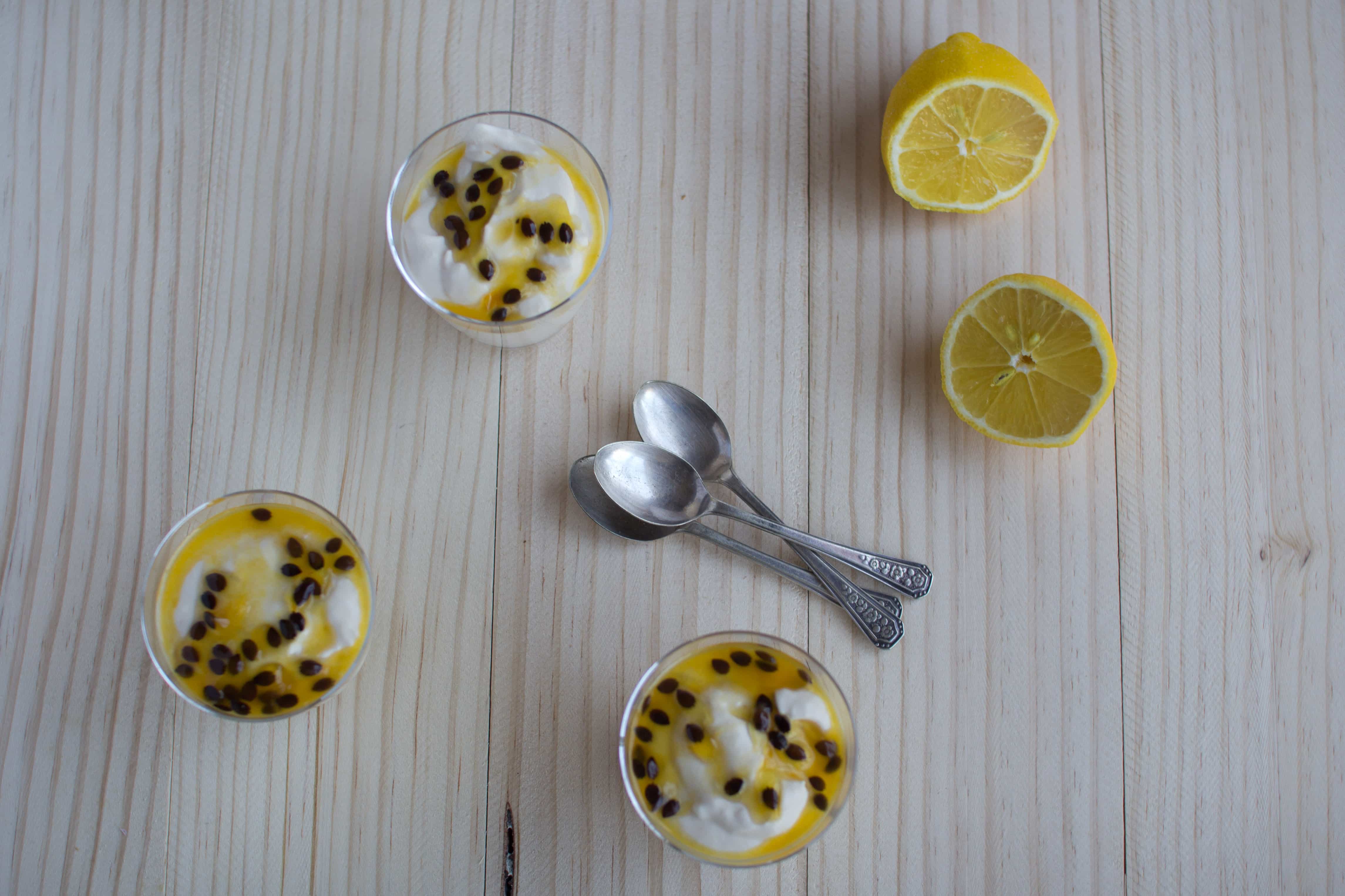Place the juice from the lemons in a small pot and heat over a medium heat until it boils. Add the sugar, stir till dissolved. Add the gelatine, stirring well with a fork until it has all dissolved. Mix the gelatine mix into the yoghurt. Next, gently fold the cream into the yoghurt/gelatine mix. When it’s combined, spoon the mixture into small glasses or ramekins. Refrigerate until set. I takes a couple of hours in the fridge, but you could speed things up in the freezer.