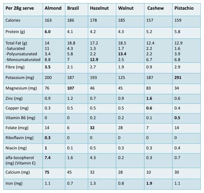 Whoever made the quote good things come in small packages could have been talking about nuts – a small serve is a nutrient packed snack. But do you know how different nuts stack up nutritionally? While all nuts are a good source of healthy fats, vitamins and minerals, some are better sources of certain nutrients than others. Here’s how 6 varieties of tree nuts stack up. The bold numbers indicate the highest source of this nutrient from the nuts listed. The perfect portion size is a small handful – around 25-30g. This way you’ll get a good serve of nutrition without overdosing on calories.