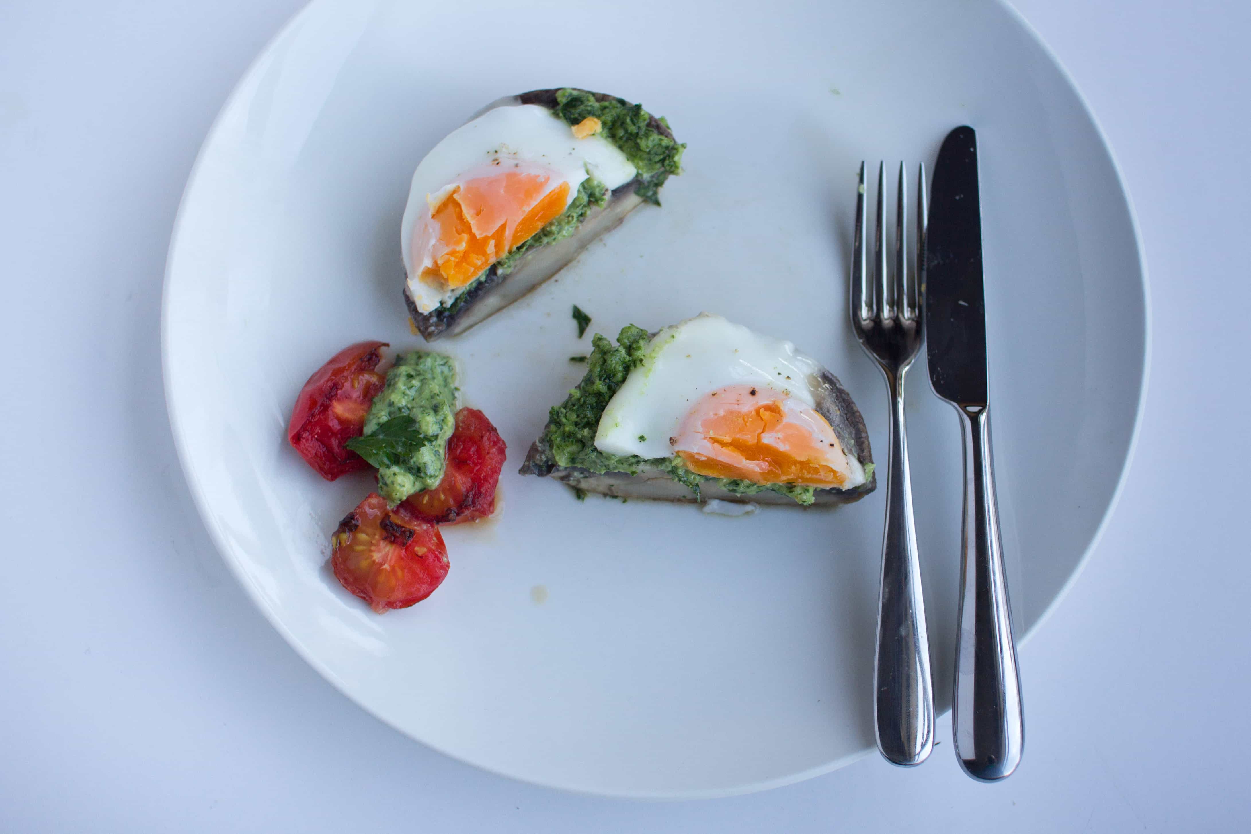 Take one portabello mushroom and wipe clean. Place in a pan with 1 tsp oil on a medium heat. Add a sprinkle of worchester sauce on the mushroom. Spread with the pesto and crack the egg on top of the mushroom. Cover with a lid and cook over a slow heat. To stop the mushroom from burning on the bottom, add a tablespoon or two of water to the bottom of the pan during cooking – this helps create steam which cooks the egg.