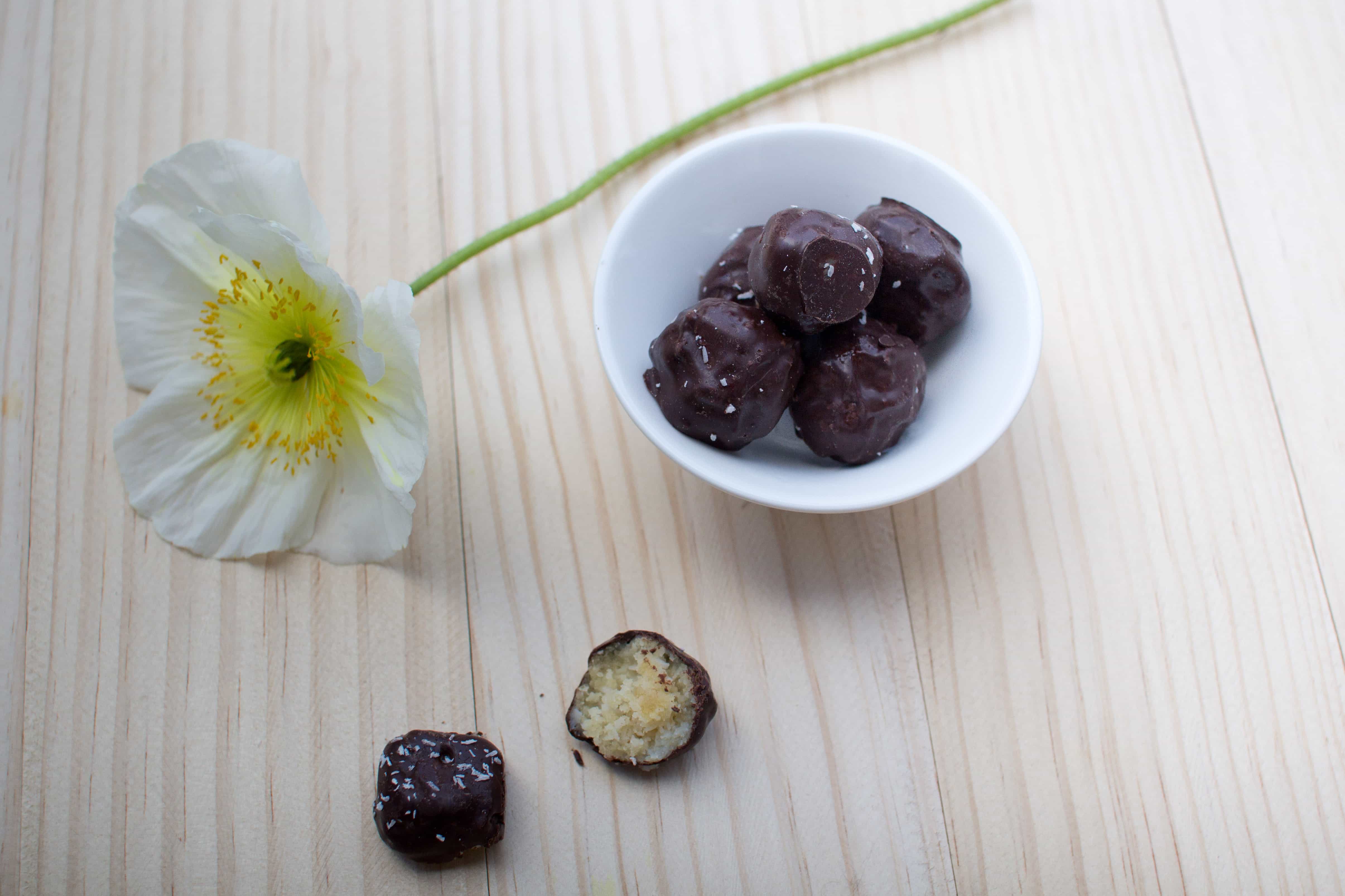 Dip the balls in the chocolate and place on baking paper until set.