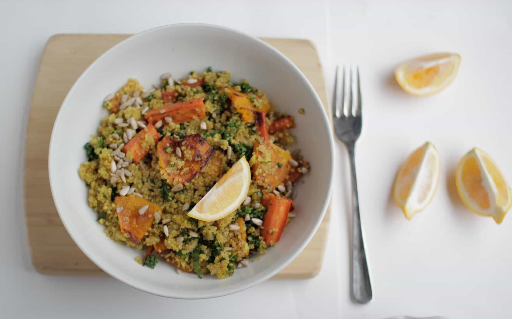 Quinoa salad has become a go to lunch for me this winter. It is a great base for so many different flavours and provides a source of protein as well as slow release carbohydrates. This quinoa salad recipe combines quinoa along with pumpkin and carrots with a touch of kale and sunflower seeds.