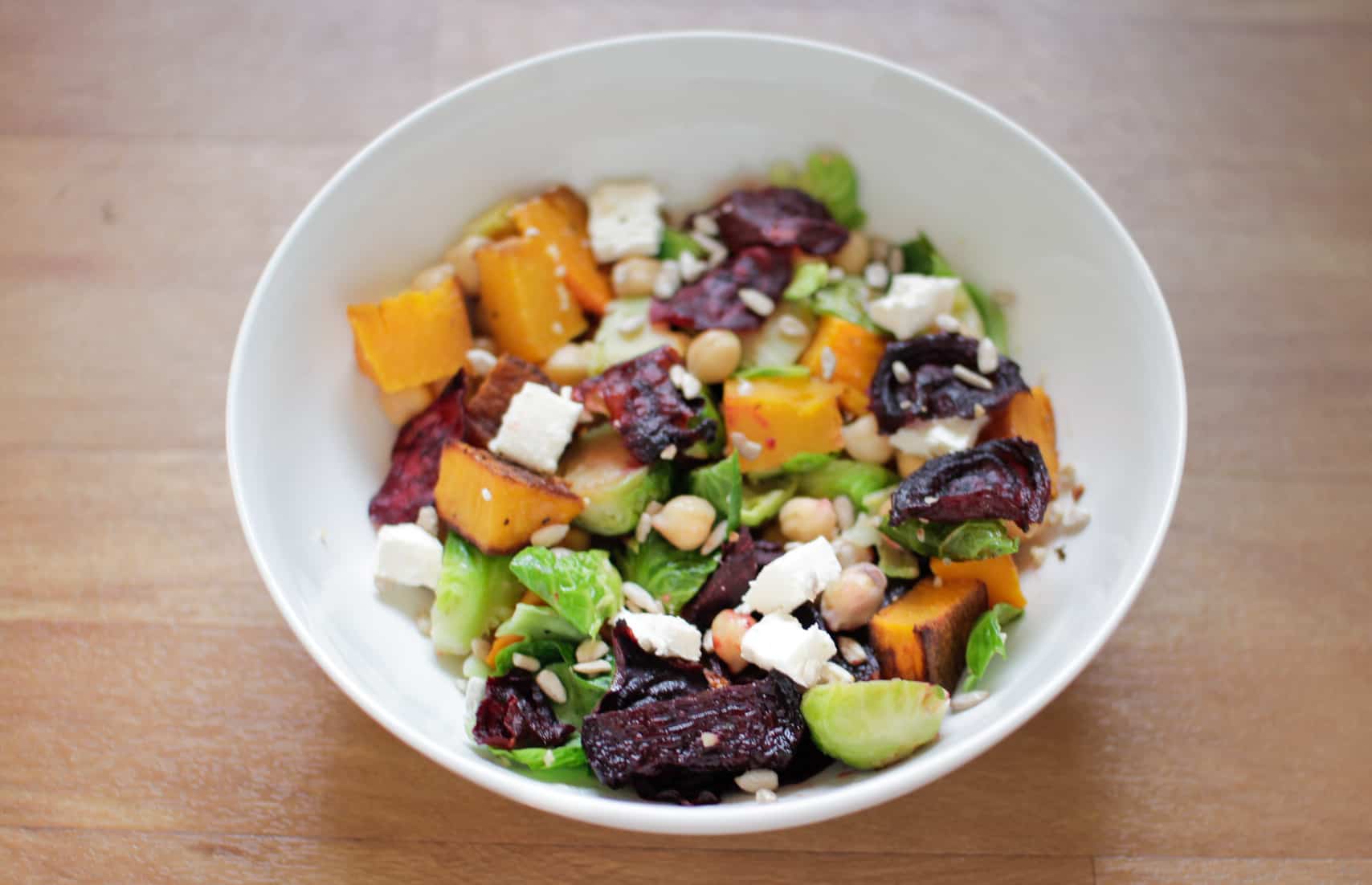 Lunch time is a good opportunity to pack some veges into your diet but as it get’s cooler salads are becoming less appealing. I made a big bowl of this the other day to last me a couple of lunches and it was really yummy. With roasted beet, pumpkin and Brussels sprouts it’s a bright rainbow of colours which means lots of antioxidants and nutrients.
