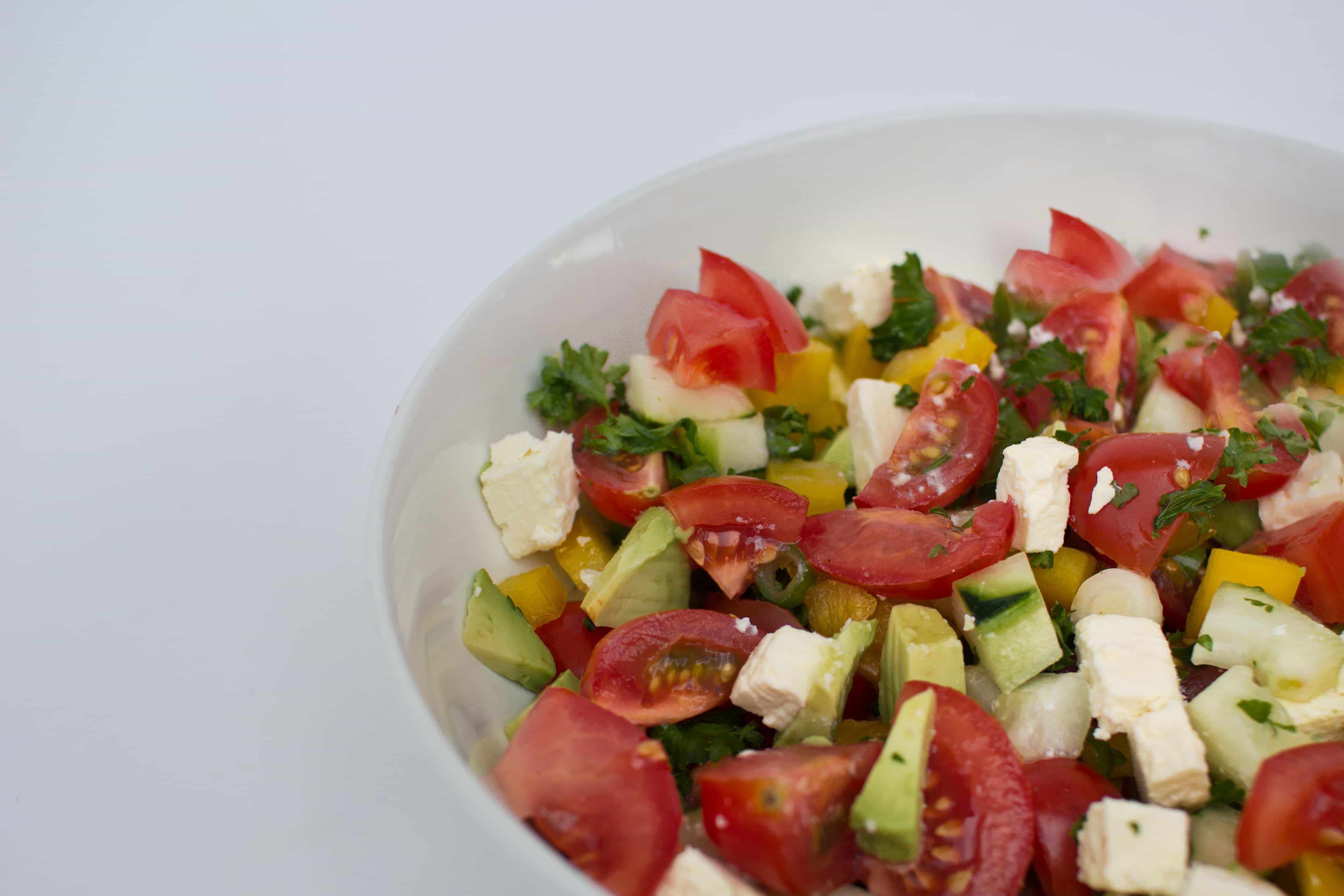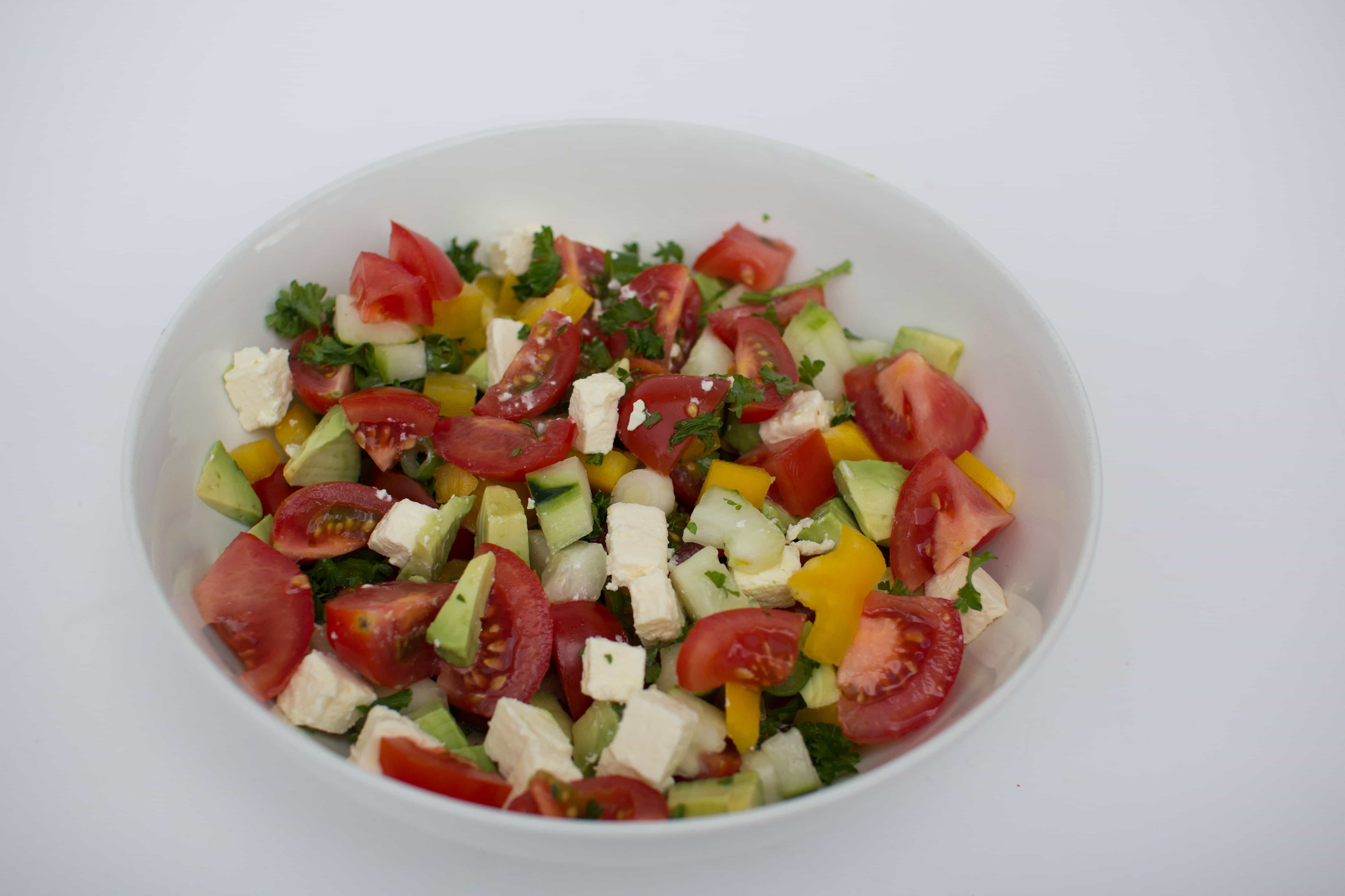 This salad is simple to prepare. Remove seeds and core from capsicum and finely dice into small pieces. Place in a bowl. Chop the tomatoes and avocado and add to the capsicum. Finely chop the herbs and chop the spring onions into rounds. Peel the cucumber and cut into small chunks. Add these to the other vegetables in the bowl. Cut the cheese into small cubes and mix through the salad.