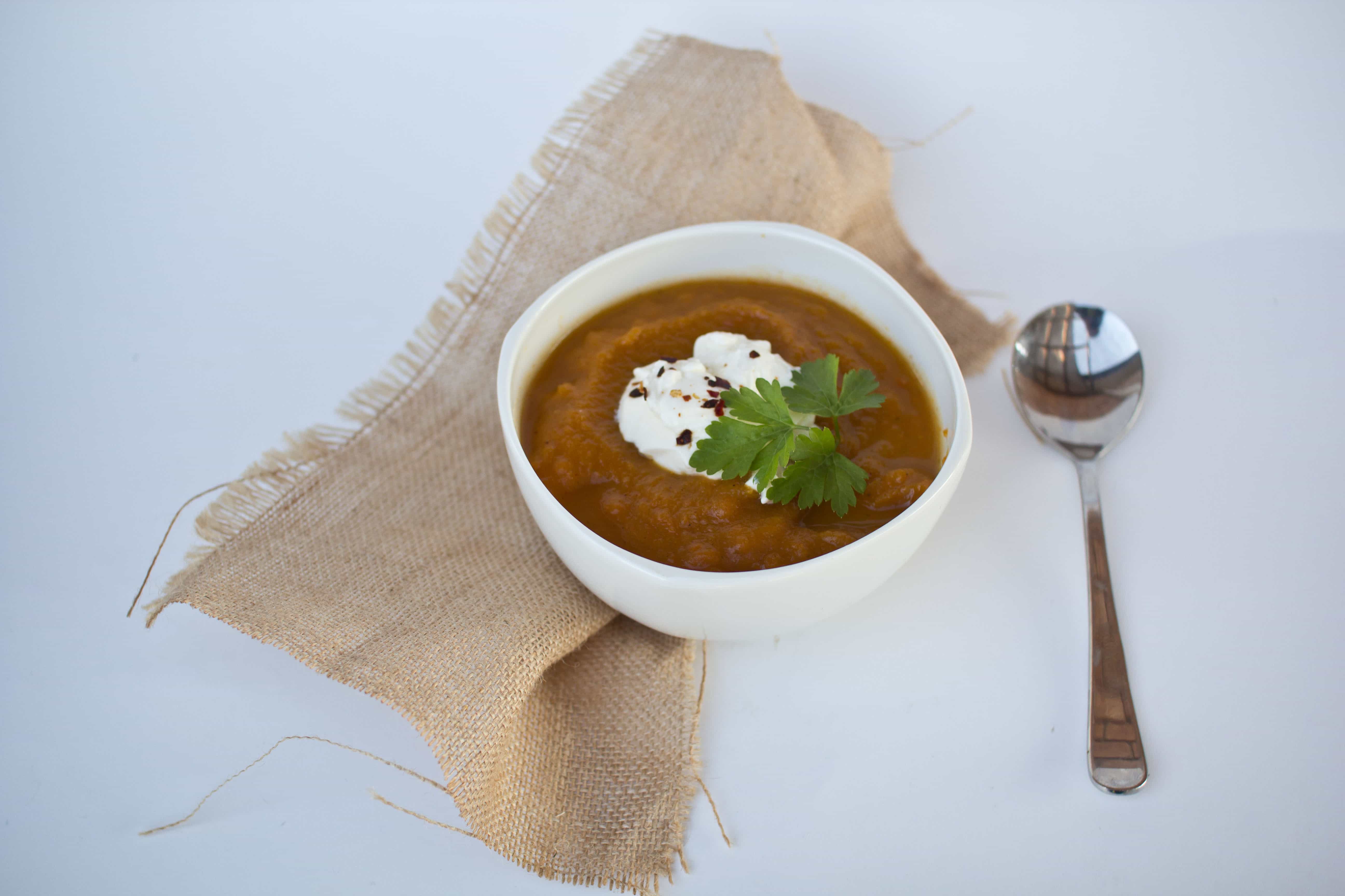 Preheat oven to 180 degrees Celsius. Peel vegetables and cut into similar sized pieces. Place on an oven tray, drizzle over the olive oil and sprinkle over the Moroccan seasoning and smoked paprika. Place the whole bulb of garlic on the tray. Roast for 35 minutes. Remove vegetables from oven. When cool enough to handle, squeeze the garlic from it’s skin and place into a pot. Add the other vegetables along with the stock and water and simmer for 20 minutes.