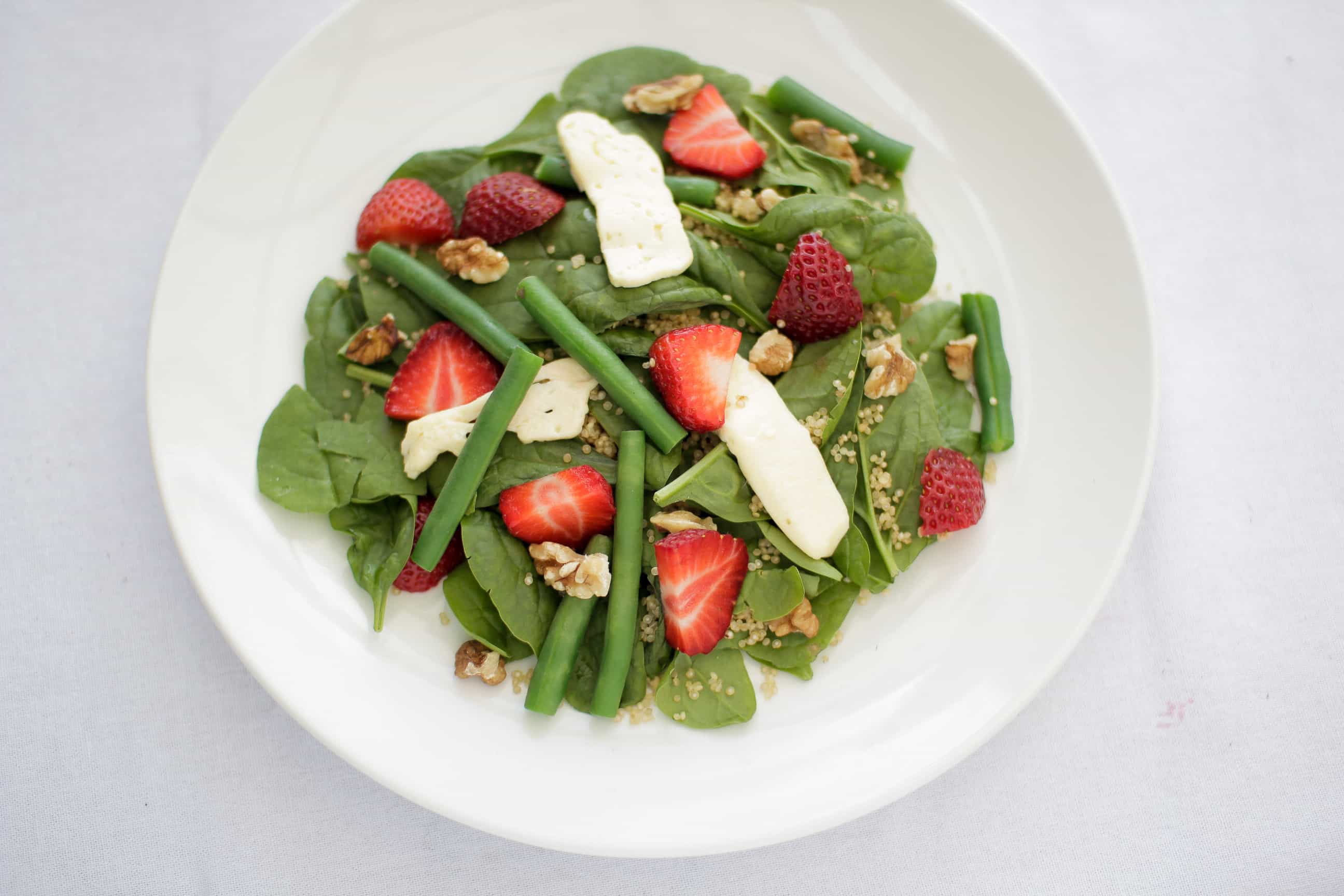 Rinse the quinoa under running water in a sieve. Place in a pot with one cup of water. Bring to the boil and simmer for approximately 12 minutes until all liquid has absorbed. Set aside. Cut the ends off the beans and put in a pot of boiling water for two minutes. Drain and leave the beans to cool. Cut up halloumi and put slices in a hot frypan for a few minutes. Mix the quinoa, strawberries, beans, walnuts, and spinach. Add slices of halloumi and add a touch of balsamic vinaigrette. Eat up!