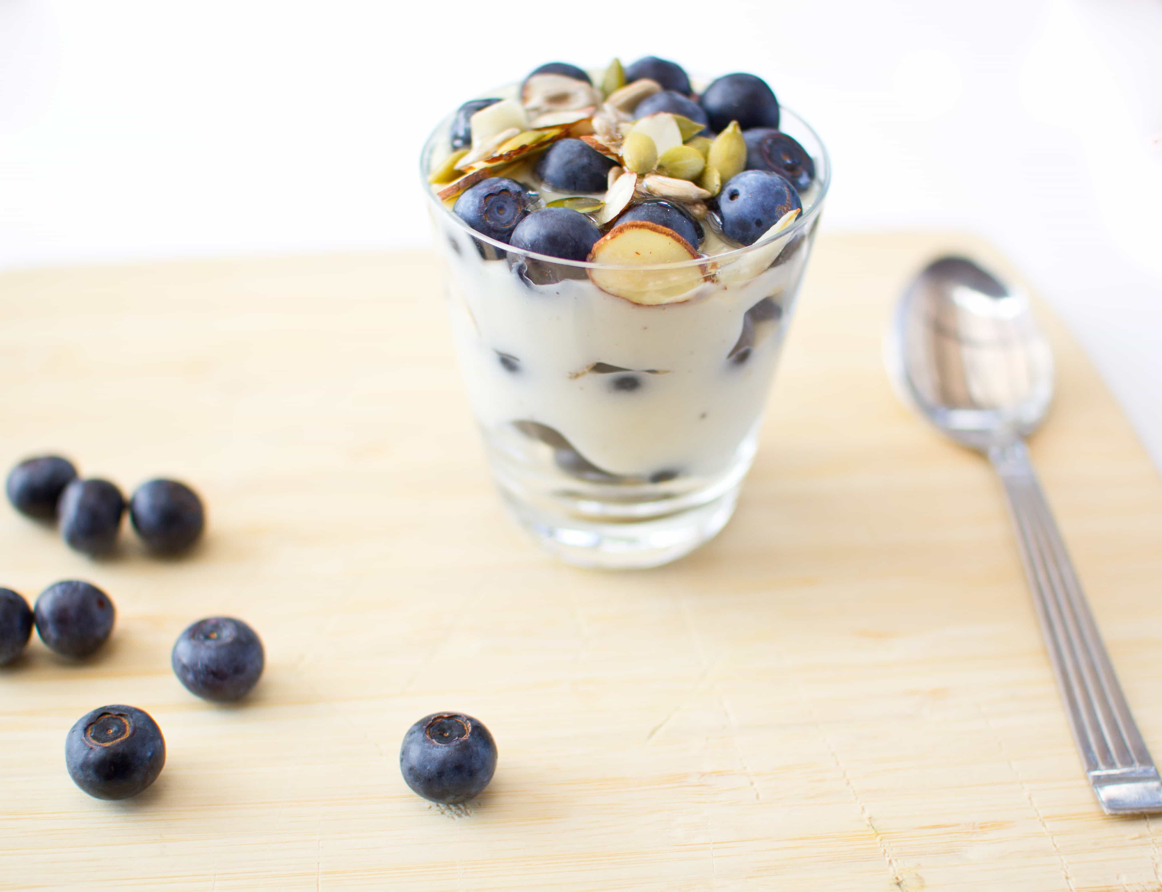 Blueberries and yoghurt are my favourite thing to eat for a snack right now. The other day, I felt inspired to ‘pimp’ it up a little and I came up with this simple but delicious idea. Mix in 1 tablespoon of vanilla flavoured protein powder with vanilla yoghurt and then layer it with berries. Simple but delicious and also quite filling. Here’s what I used.