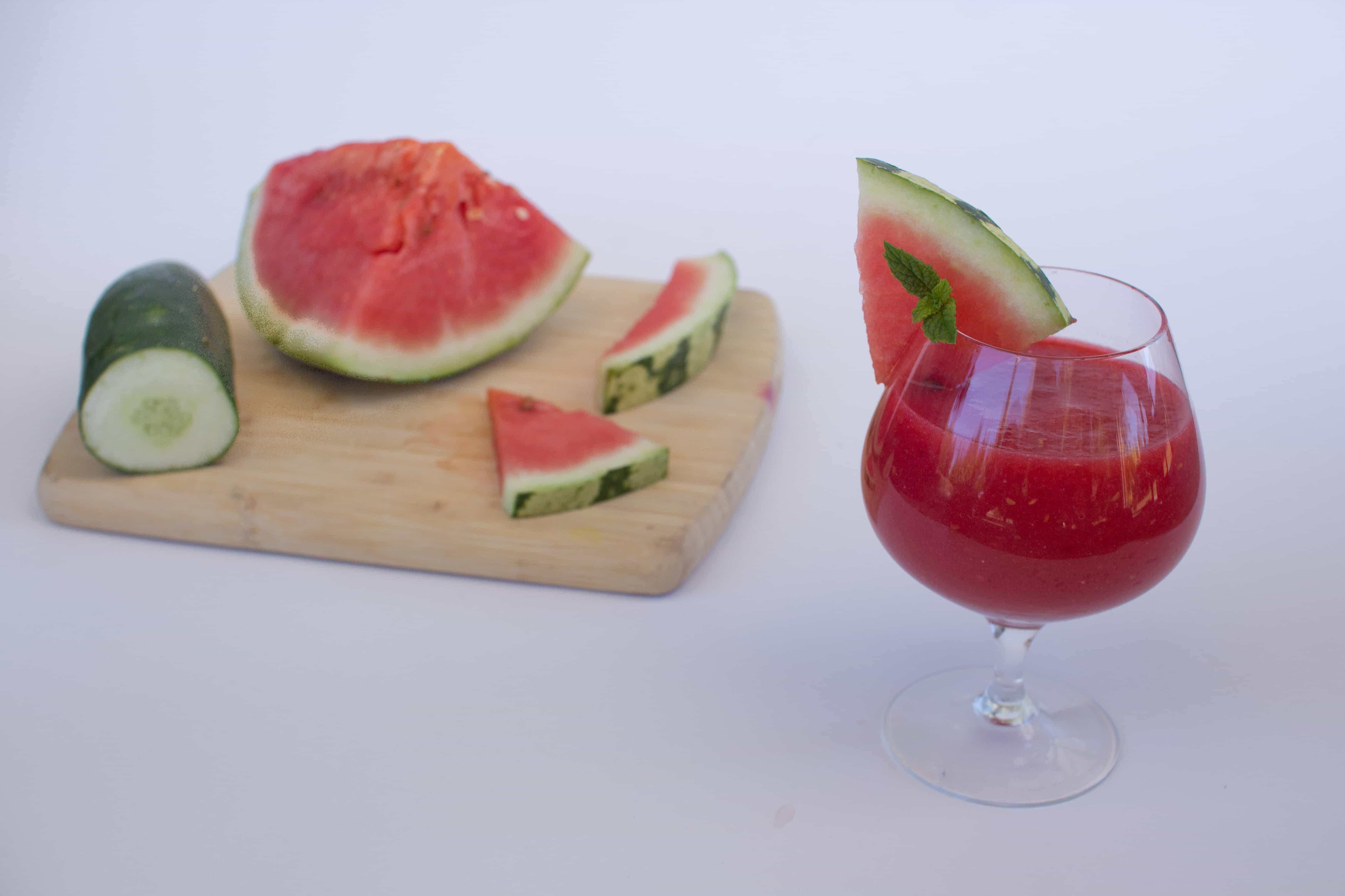 When it’s hot, there is nothing more refreshing than watermelon. And it’s no wonder, because it’s 92% water. Watermelon is a good source of vitamins A and C and is also a source of vitamin B6. It’s a sweet, healthy and delicious way to hydrate. Watermelon also makes a fabulous smoothie and I recently created this version as a yummy, refreshing snack. It’s simple to make, with a blend of fruits and some cucumber which adds to the refreshing flavour, plus provides a bit of a vegetable boost to your day. The cucumber flavour isn’t overpowering but it combines really well with the sweetness and flavour of the watermelon.