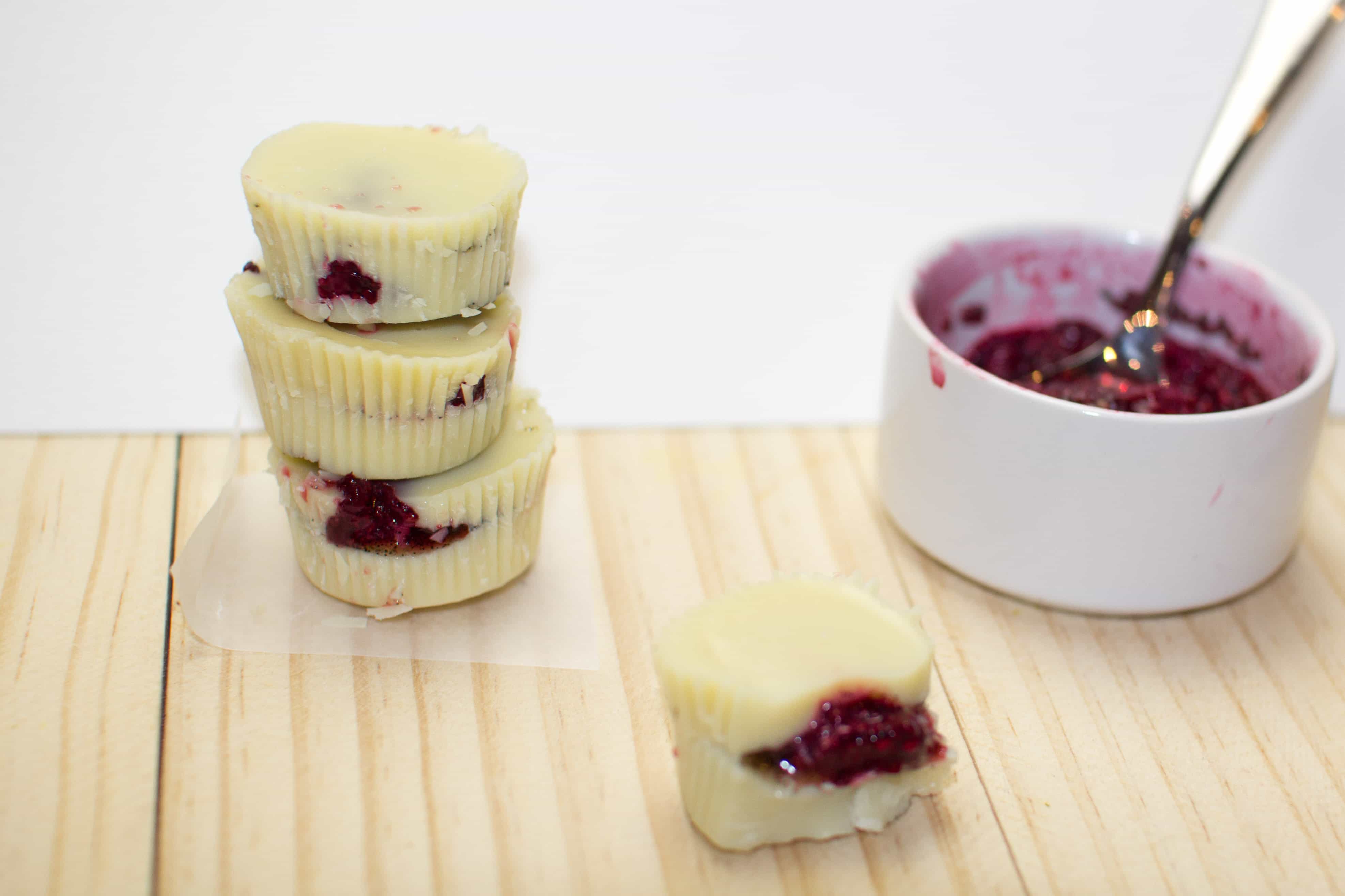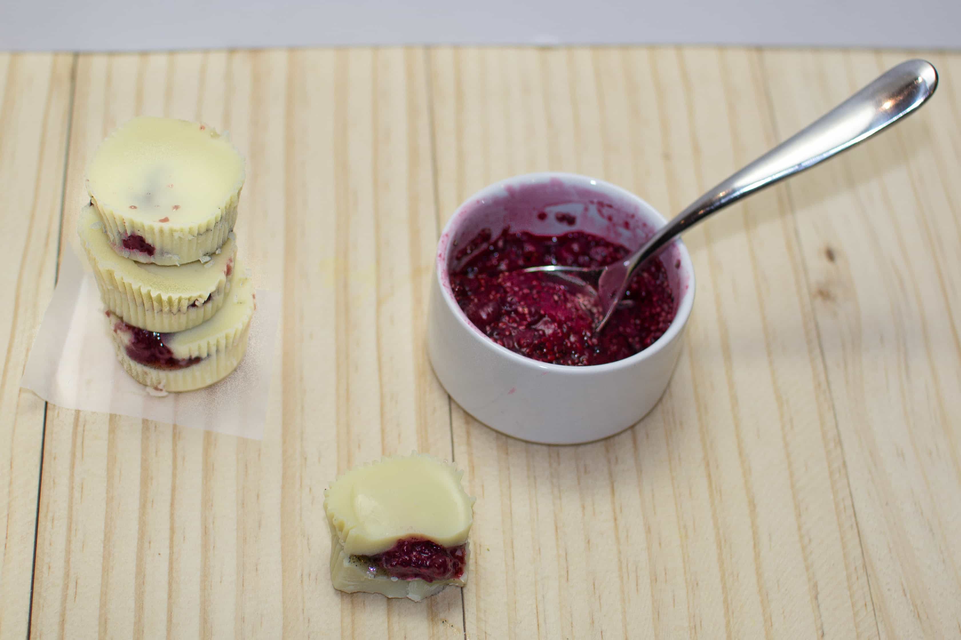 While the berry filling is doing it’s thing, fill mini cupcake cases 1/4 fill with the white chocolate mixture and place in the fridge until set. This doesn’t take too long – 5 minutes or so.