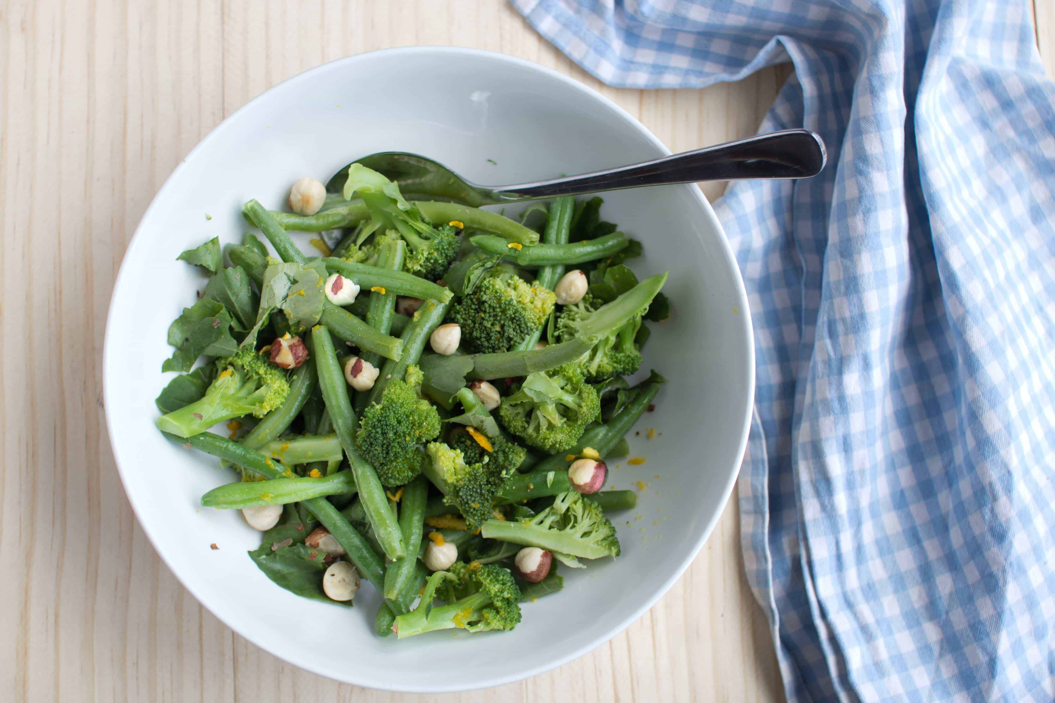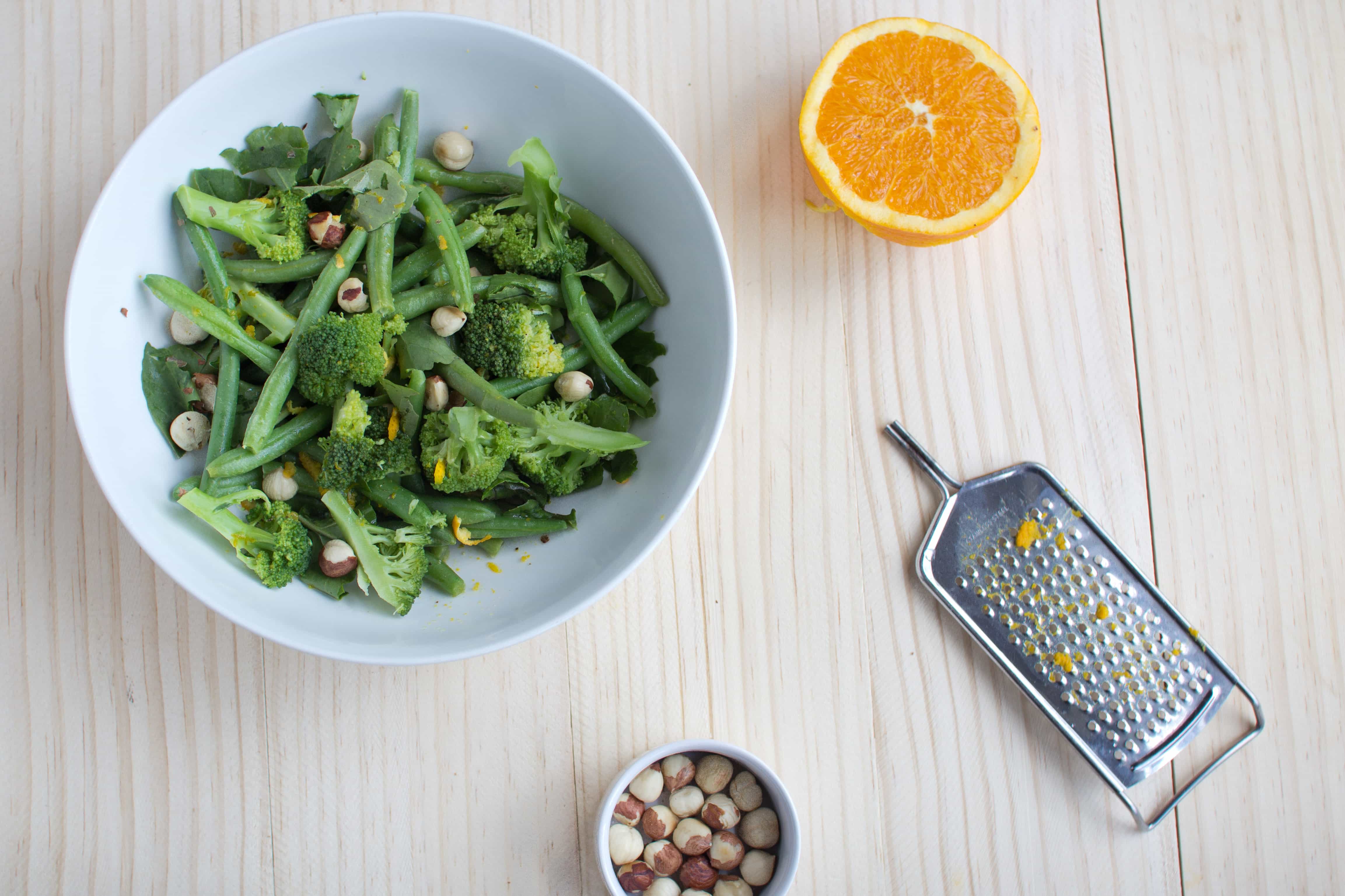 Steam the green vegetables until just cooked. You want the broccoli to be slightly crisp to bite, not soggy. While the vegetables are cooking, place the orange juice, zest, and olive oil in a bowl or shaker and wisk/shake until combined. Drizzle the dressing over the cooked greens and sprinkle over the hazelnuts and chives.